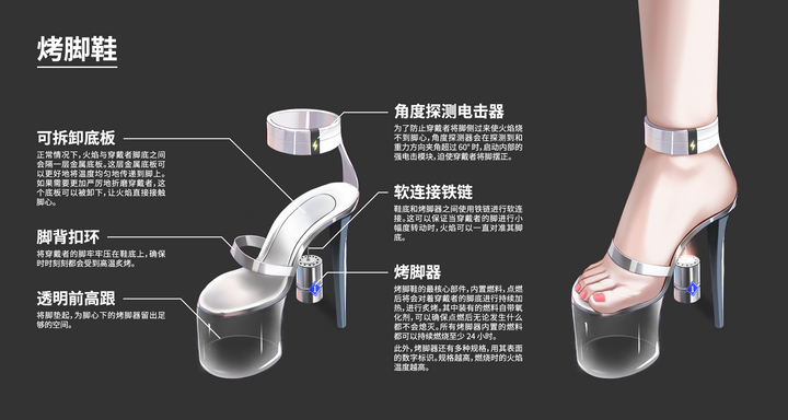 我并不知道为什么要防止脚底烫伤,我只得顺从地将脚伸进了石倚打开的白色扣环中,并放在了高跟鞋上。由于高跟鞋是金属制成的,一股寒意从我的脚下传来。石倚关上了白色的扣环,不用说,那一定也是上了锁的。